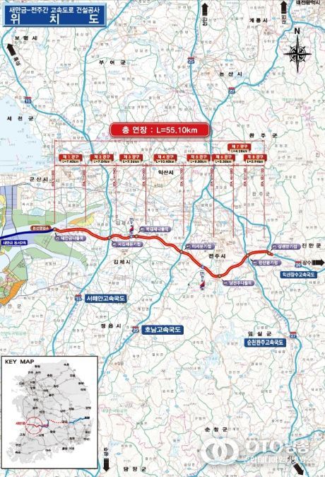 새만금-전주 고속도로는 전라북도 김제시 진봉면에서 전주시를 거쳐 완주군 상관면을 연결하는 총 연장 55.1km의 왕복 4차로 도로로 총사업비 2조 7,424억원을 투입했다.