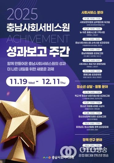 oto방송 김민석 기자 | 충남사회서비스원(원장 김영옥)이 오는 11월 19일부터 12월 11일까지를 ‘2025 사회서비스원 성과보고 주간’으로 지정하고, 올해 추진한 사회서비스·청소년·정책연구 등 3개 분야에서 총 11개의 주요 사업 성과를 도민에게 공개하는 대규모 홍보 기간에 들어간다.