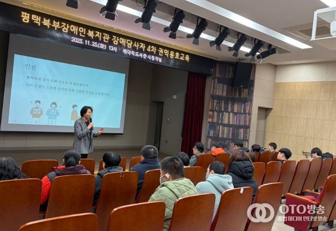 oto방송 김민석 기자 | 평택북부장애인복지관(관장 유영애)은 11월 25일, 배다리도서관에서 관내 3개 기관의 장애 당사자들을 대상으로 '2025 장애당사자 제4차 권익옹호교육'을 실시하며, 금년도 계획된 권익옹호교육 일정을 모두 마무리했다.
