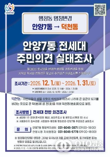 조사방법은 올해 12월 1일부터 2026년 1월 31일까지 시 홈페이지를 통해 비대면 조사를 진행하고, 12월 18일부터 2026년 1월 31일까지 안양7동 행정동명칭변경추진위원회가 각 세대 방문조사를 병행하게 된다.