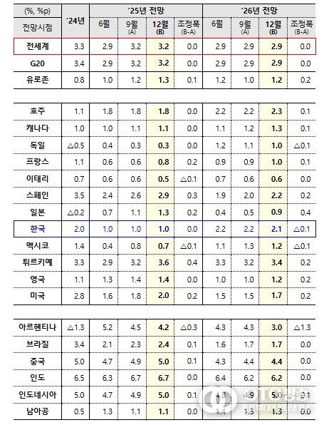 향후 세계경제 성장률은 ’25년 3.2%, ’26년 2.9%, ’27년 3.1% 수준으로 전망된다. 지역별로 살펴보면, 미국은 고용 부진과 관세 인상에 따른 물가 전가 등의 영향으로 ’26년 성장세가 둔화(’25년2.0→’26년1.7→’27년1.9%)될 전망이다. 일본은 금년 내수를 바탕으로 견조한 성장을 기록하겠으나 순수출이 하방요인으로 작용하며 성장세가 둔화(’25년1.3→’26년0.9→’27년0.9%)될 것으로 예상된다. 유로 지역은 ’26년 소폭 둔화된 이후 내수 회복과 무역 반등에 힘입어 ’27년 회복(’25년1.3→’26년1.2→’27년1.4%)할 전망이다. 중국의 경우 부동산 부문의 지속 부진과 조기선적 효과 소멸 등의 영향으로 성장세가 둔화(’25년5.0→’26년4.4→’27년4.3%)될 전망이다.