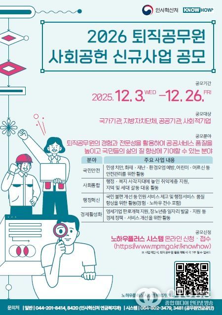 인사혁신처는 공무원이 재직기간에 쌓은 경험과 기술(노하우)을 활용하는 ‘2026년 퇴직공무원 사회공헌 신규사업’ 공모를 오는 26일까지 진행한다고 밝혔다.