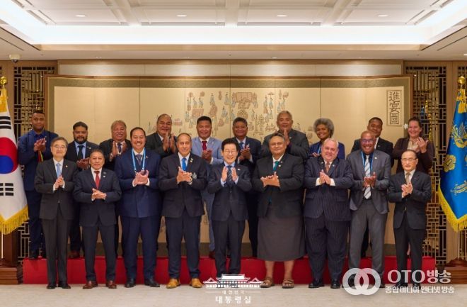 oto방송 김민석 기자 | 이재명 대통령은 12월 10일 오전, 대통령실에서 제6차 한-태평양도서국 외교장관회의 참석을 위해 방한한 태평양도서국 외교장관 일행을 접견했다.