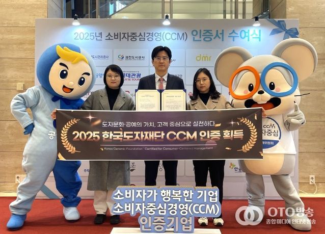 oto방송 김민석 기자 | 한국도자재단이 12일 서울 서초구 엘타워에서 열린 ‘2025년 소비자중심경영 우수기업 포상 및 인증서 수여식’에서 공정거래위원회가 인증하고 한국소비자원이 운영하는 ‘2025년 소비자중심경영(CCM) 인증’을 획득했다.