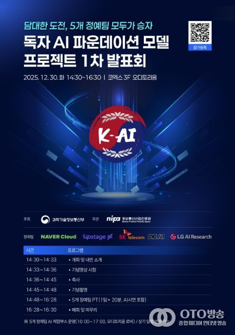 oto방송 김민석 기자 | 과학기술정보통신부와 정보통신산업진흥원(원장 박윤규)은 오는 12월 30일 14:30, 코엑스 오디토리움에서, 「독자 AI 파운데이션 모델」 프로젝트 1차 발표회를 개최한다.