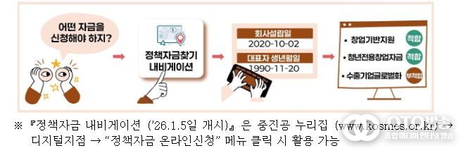 먼저, 기업의 정책자금 신청부담을 완화하기 위해 ‘정책자금 내비게이션’을 신규 도입한다. 정책자금 내비게이션은 기업이 자금 신청 시, 업력·폐업여부·수출실적·자금용도 등 기초정보를 입력하면 내비게이터가 해당 정보를 토대로 맞춤형 적합자금을 추천해주는 시스템으로, 어떤 자금이 기업에게 적합한지 알려주는 길잡이 역할을 할 것으로 기대된다.