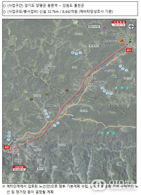 oto방송 김민석 기자 | 국토교통부는 12월 22일 열린 재정사업평가위원회(기획재정부 주관)에서 용문~홍천 광역철도 건설사업이 예타를 통과하고, 증평-호법 등 2개 고속도로 확장사업이 예타 대상 사업에 선정됐다고 밝혔다.