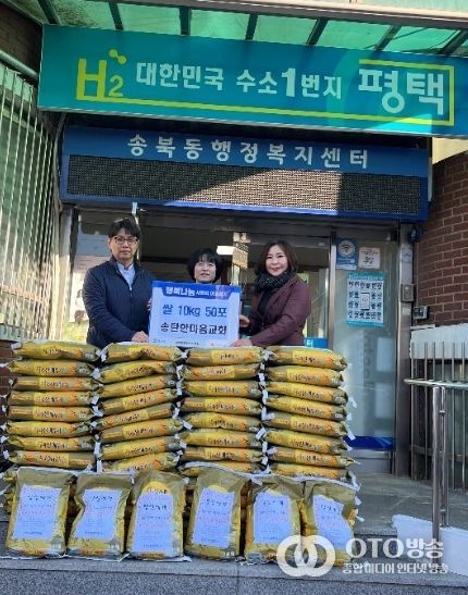 oto방송 김민석 기자 | 송탄한마음교회는 최근 크리스마스를 맞아 어려운 이웃들에게 따뜻한 마음을 전하기 위해 쌀 10㎏ 50포(총 500㎏)를 평택시 송북동 행정복지센터에 전달했다.