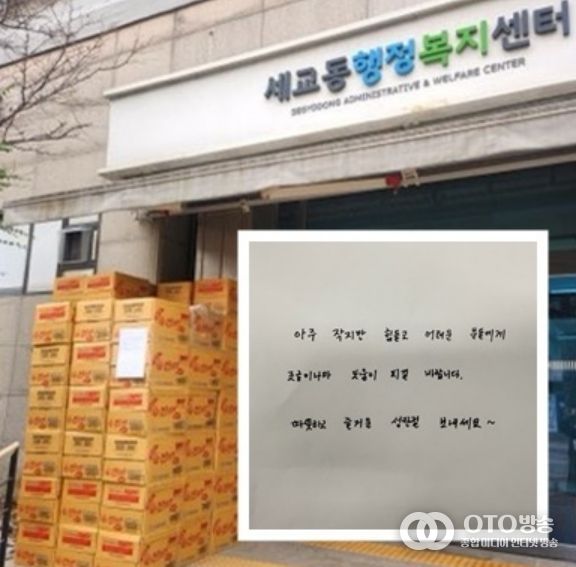 23일 오전, 세교동 행정복지센터 입구에는 이름을 밝히지 않은 기부자가 남기고 간 메모와 라면 100상자가 놓여 있었다.