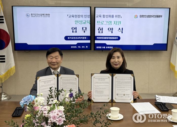 oto방송 김민석 기자 | 경기도안산교육지원청은 12월 23일 오후 3시 30분, 따뜻한인성함양국민운동본부와 학교 현장의 인성교육 강화와 도덕성 회복을 위한 지역 연계형 인성교육 지원 체계 구축을 위한 업무협약(MOU)을 체결했다.