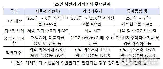 이번 기획조사는▴서울·경기 주택 이상거래(’25.5월~6월 거래신고분),▴부동산 실거래가 띄우기(’23.3월~’25.8월 거래신고분), ▴특이동향 등(’25.1월~7월 거래신고분) 3가지 분야에 대해 실시됐다.