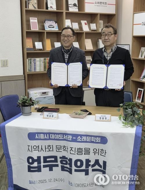 oto방송 김민석 기자 | 시흥시 대야도서관은 지역 문학단체인 소래문학회와 지난 12월 24일, 대야도서관 휴게실에서 지역 문학 진흥 및 독서문화 확산을 위한 업무협약을 체결했다.