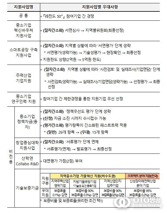 또한 정책자금, 창업·성장, R&D, 보증 분야에는 선정 절차 간소화, 평가 면제 또는 가점 부여, 지원한도 상향, 보증조건 우대 등 현장의 의견을 반영한 다양한 제도개선 사항이 적용된다.