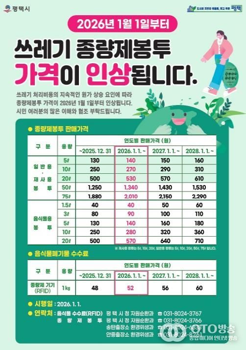 oto방송 김민석 기자 | 평택시는 2026년 1월 1일부터 쓰레기 종량제 봉투 가격을 3개년도에 걸쳐 인상한다.
