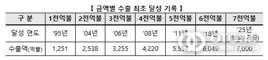 수출 7,000억 달러는 ‘18년도 6,000억 달러 달성 이후 7년만에 이뤄낸 쾌거로 전(全) 세계에서 6번째로 달성하며 수출강국 위상을 재확인했다. 특히, 6천억불은 7번째로 달성했으나, 7천억불은 6번째로 달성하며 우리 수출이 글로벌 주요국 대비 빠르게 성장하고 있음을 증명했다.