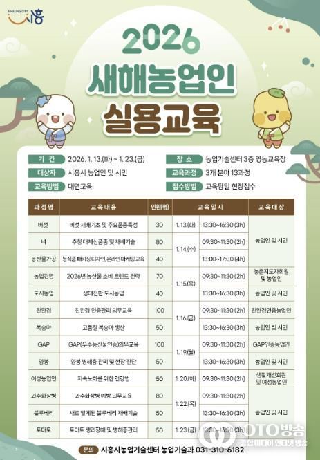oto방송 김민석 기자 | 시흥시는 농업인의 전문역량 강화와 안정적인 영농 활동을 지원하기 위해 ‘2026년 새해농업인 실용교육’을 오는 1월 13일부터 23일까지 시흥시농업기술센터 3층 영농교육장에서 운영한다.
