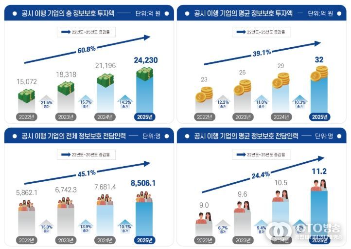oto방송 김민석 기자 | 최근 침해사고 급증에 따라 정보보호 필요성이 높아진 현 상황에서 정보보호에 대한 전 국민의 알 권리 확보를 위하여 과학기술정보통신부는 12월 30일 기업의 2025년 정보보호 투자 및 인력 현황 등을 분석한 “2025년 정보보호 공시 현황 분석보고서”를 공개했다.