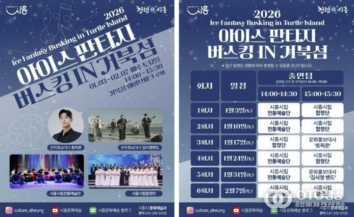 oto방송 김민석 기자 | 시흥시는 지난 연말에 진행된 ‘2025 시흥 사운드 오브 윈터’의 열기를 잇는 후속 문화예술 프로그램으로, 겨울철 거북섬을 찾는 시민과 관광객에게 풍성한 즐길 거리를 제공하고자 ‘2026 아이스 판타지 버스킹 인 거북섬’을 운영한다.