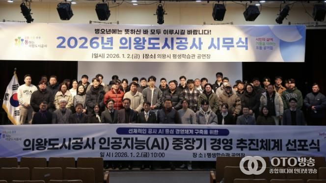 oto방송 김민석 기자 | 의왕도시공사가 1월 2일, 평생학습관 공연장에서 개최된 시무식에서 인공지능(AI) 경영 문화 확산을 위한 ‘인공지능 중장기 경영 추진체계 선포식’을 개최했다.