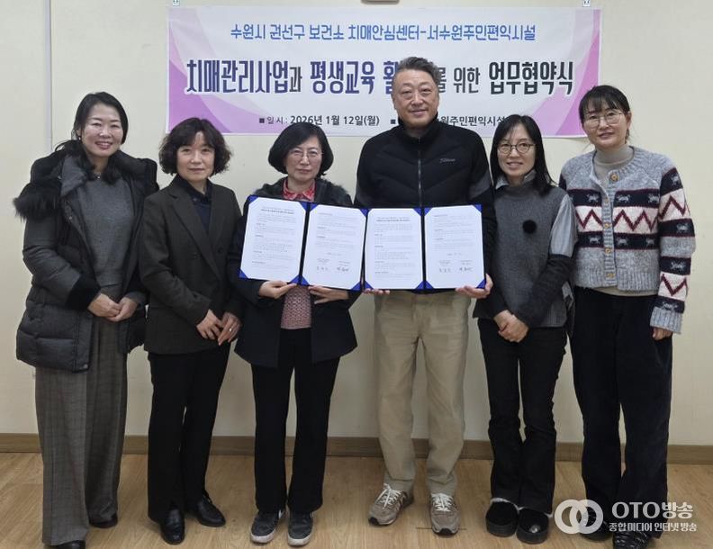oto방송 김민석 기자 | 수원시 권선구보건소 치매안심센터와 서수원주민편익시설은 12일 서수원주민편익시설 강의실에서 치매관리사업과 평생교육 활성화를 위한 업무협약을 체결했다.