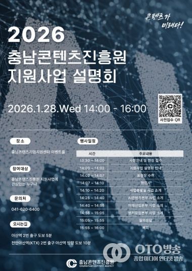 oto방송 김민석 기자 | (재)충남콘텐츠진흥원(원장 김곡미)은 오는 1월 28일 오후 2시, 충남콘텐츠기업지원센터 이벤트홀에서 ‘2026년 지원사업 설명회’를 개최한다고 밝혔다.