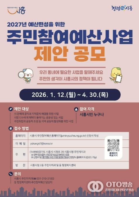 oto방송 김민석 기자 | 시흥시는 오는 4월 30일까지 주민들이 직접 사업을 제안하는 ‘시흥시 주민참여예산 제안’을 신청받는다.