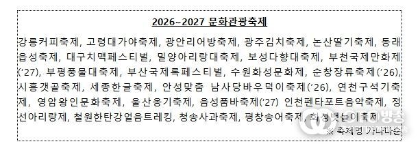 oto방송 김민석 기자 | 문화체육관광부는 ‘2026~2027 문화관광축제’로 27개를 최종 선정해 발표했다. 이 중 20개는 기존 ‘2024~2025 문화관광축제’ 중에서 재지정한 것이며, 최근 청년세대와 가족 단위 관광객에게 큰 인기를 끌고 있는 부산국제록페스티벌, 논산딸기축제, 세종축제 등 7개는 새롭게 선정했다.