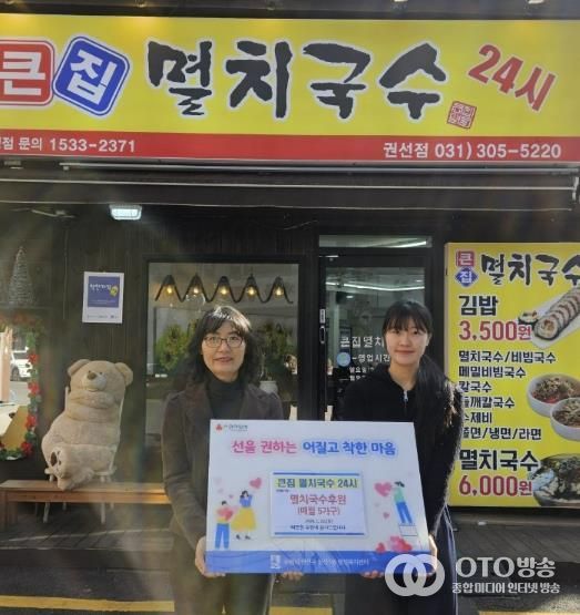oto방송 김민석 기자 | 권선1동 행정복지센터는 1월 22일, 관내 음식점인 “큰집멸치국수”가 지역 내 취약계층을 위해 매월 5 가구에 멸치국수를 정기 후원하기로 했다고 밝혔다.