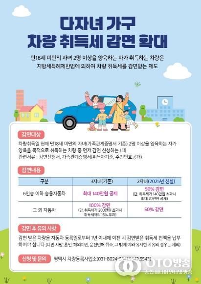 oto방송 김민석 기자 | 평택시 차량등록사업소는 『지방세특례제한법』 개정으로 올해부터 다자녀 양육 자동차 취득세 감면 대상이 3자녀에서 2자녀로 확대됐다고 밝혔다.