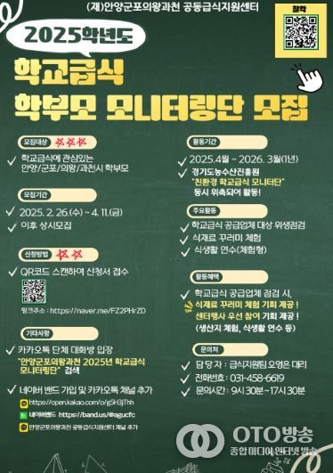 oto방송 김민석 기자 | (재)안양·군포·의왕·과천 공동급식지원센터는 학부모를 대상으로 ‘2025학년도 학교급식 학부모 모니터링단’ 100명을 모집 중이라고 5일 밝혔다.