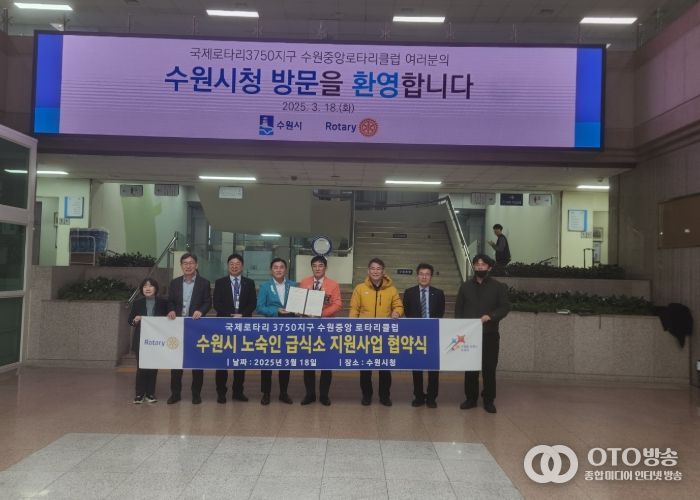 oto방송 김민석 기자 | 수원시와 국제로타리3750지구 수원중앙로타리클럽, 수원다시서기노숙인종합지원센터는 18일 수원시청에서 ‘노숙인 실내급식소 지원 업무 협약’을 체결했다.