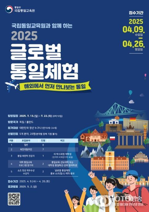 통일부 국립통일교육원은 광복 80주년을 맞아 ‘글로벌 통일체험’에 참여할 20명의 청년을 모집한다고 밝혔다.