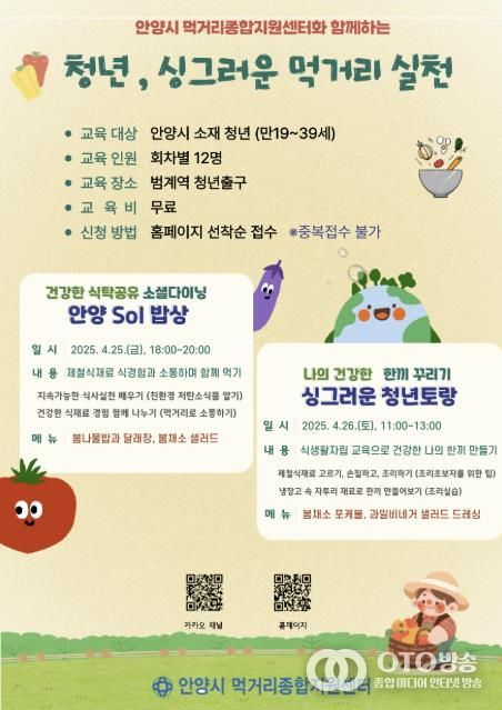 oto방송 김민석 기자 | 안양시 먹거리종합지원센터는 청년대상 식생활 자립실천 지원을 위해 먹거리로 건강하게 소통하는 소셜다이닝 ‘안양 Sol 공유밥상’ 과 건강한 식사 챙기기 조리실천 교육 ‘싱그러운 청년토랑’ 상반기 프로그램을 본격적으로 시작한다고 25일 밝혔다.