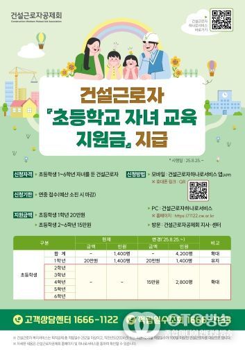 oto방송 김민석 기자 | 건설근로자공제회(이사장 김상인)는 침체된 건설경기를 고려한 건설근로자 추가 지원 대책으로 초등학교 2~6학년 자녀가 있는 건설근로자 2,800명에게 자녀 1명당 15만원의 교육비를 지원한다고 25일 밝혔다. 총 지원 규모는 4억 2천만 원이며, 선착순 마감이다.