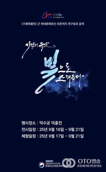 oto방송 김민석 기자 | 국가유산청 국립문화유산연구원 문화유산보존과학센터는 광복 80주년을 맞아 오는 9월 16일부터 21일까지 6일간 덕수궁 덕홍전(서울 중구)에서 광복과 독립운동의 상징적 유물이 보존처리를 통해 어떻게 되살아났는지 그 과정을 영상과 사진으로 조명한 기획전 '기억의 유산, 빛으로 스며들다'를 개최하고, 9월 16일 오후 2시에 개막식을 개최한다.