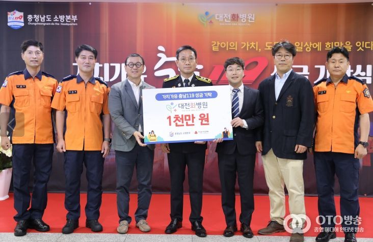 oto방송 김민석 기자 | 충남소방본부는 5일 도청 7층 소방본부에서 ‘가치가유 충남119’ 성금 전달식을 열고, 대전화병원으로부터 1000만 원을 기탁받았다.