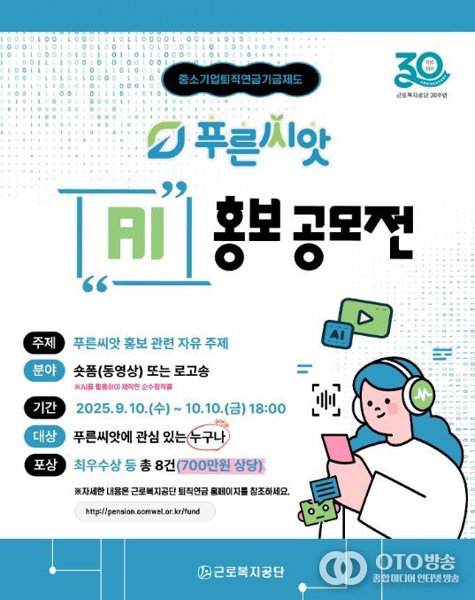 oto방송 김민석 기자 | 고용노동부 근로복지공단은 중소기업퇴직연금기금제도 ‘푸른씨앗’ 출범 3주년을 기념해 대국민 인지도 제고를 위한 인공지능(AI) 홍보 공모전을 개최한다고 3일 밝혔다.