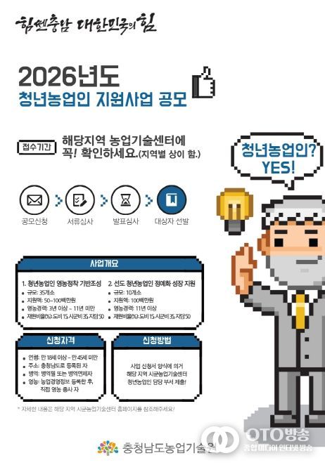 oto방송 김민석 기자 | 충남도 농업기술원은 ‘2026년 청년농업인 지원사업’ 공모를 진행 중이라고 9일 밝혔다.