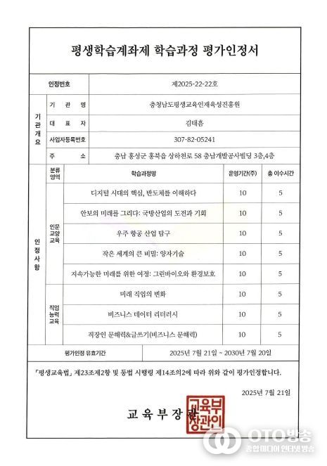 oto방송 김민석 기자 | 충남평생교육인재육성진흥원은 교육부와 국가평생교육진흥원이 주관한 제22차 평생학습계좌제 학습과정 평가인정 심사를 통과해 평가인정서를 수여받았다.