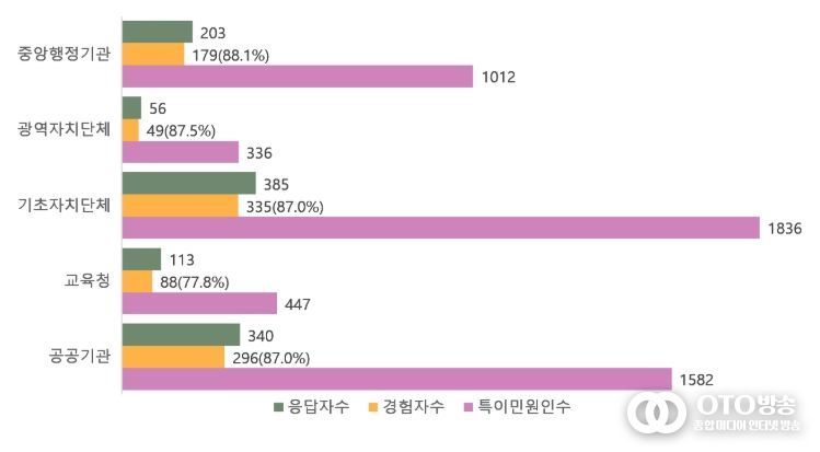 기관유형별로는 중앙행정기관(88.1%)과 광역자치단체(87.5%) 공직자의 특이민원 경험률이 더 높은 것으로 나타났고, 특이민원인의 수는 기초자치단체(1,836명)가 가장 많았다.