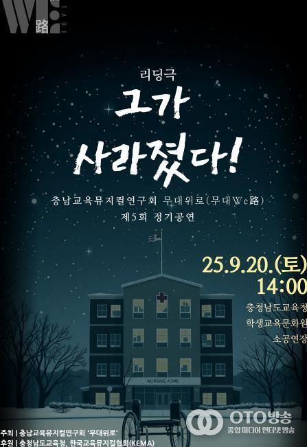 oto방송 김민석 기자 | 충남교육청은 오는 9월 20일 오후 2시, 충청남도교육청학생교육문화원 소공연장(천안)에서 충남교육뮤지컬연구회 ‘무대WE路(무대위로)’의 제5회 정기 공연 ‘리딩극 그가 사라졌다!’를 개최한다.