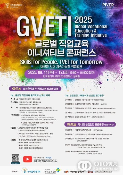 oto방송 김민석 기자 | 고용노동부 한국폴리텍대학은 한국산업안전보건공단, 한국직업능력연구원, 한국산업기술융합학회와 함께 ‘글로벌 직업교육 이니셔티브(GVETI) 콘퍼런스’를 11일부터 2일간 인천캠퍼스에서 개최한다고 밝혔다.