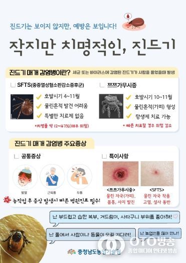 oto방송 김민석 기자 | 충남도 농업기술원은 가을철을 맞아 진드기 매개 감염병 예방수칙을 철저히 준수해 줄 것을 안내했다.