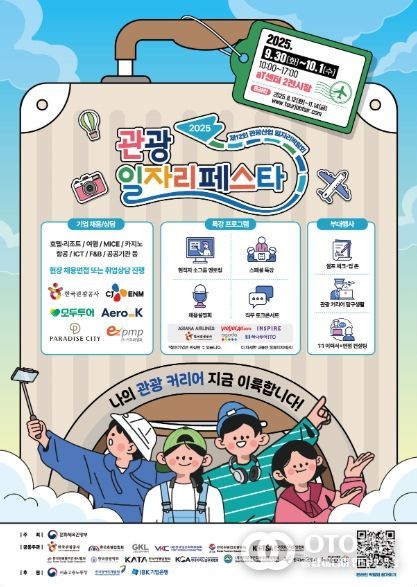 oto방송 김민석 기자 | 문화체육관광부는 한국관광공사, 한국호텔업협회 등 관광 유관 기관 및 단체와 함께 9월 30일부터 10월 1일까지 에이티센터(aT센터, 서울 서초구)에서 ‘2025 관광 일자리페스타’를 개최한다.