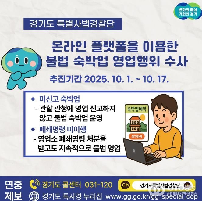 oto방송 김민석 기자 | 경기도가 10월 1일부터 17일까지 3주간 온라인 공유 숙박 플랫폼을 이용해 오피스텔 등에서 불법 숙박업을 운영하는 미신고 업소를 집중 단속한다.