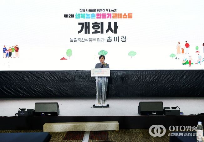 oto방송 김민석 기자 | 농림축산식품부는 9월 17일 한국마사회(과천)에서 '제12회 행복농촌만들기 콘테스트'를 성황리에 개최했다. 올해로 12회를 맞은 이번 행사에는 송미령 장관이 참석하여 개회사를 통해 그간 행복농촌 만들기에 노력해 온 마을 주민들을 격려했고, 콘테스트가 우리 농촌의 변화를 이끄는 나침반으로 자리매김하고 있다고 강조했다. 전국의 마을 주민들이 한자리에 모여 직접 마을 발전 경험과 성과를 발표하고, 우수 팀에 대한 시상식을 가졌다.