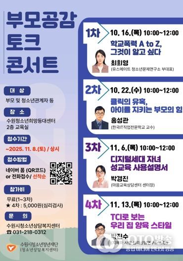 oto방송 김민석 기자 | 수원시청소년청년재단 청소년상담복지센터는 청소년기 자녀 양육에 필요한 정보를 제공하고 부모의 역량을 강화하기 위해 ‘2025년 부모공감 토크콘서트’를 오는 10월 16일부터 11월 13일까지 총 4회에 걸쳐 운영한다.