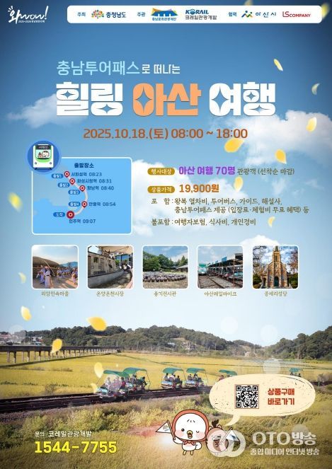 oto방송 김민석 기자 | 충남도와 충남문화관광재단은 ‘2025∼2026 충남 방문의 해’를 맞아 ‘충남 투어패스 힐링 아산여행 관광상품’을 10월 18일 운영한다고 밝혔다.
