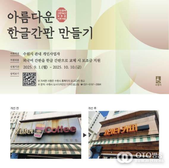 oto방송 김민석 기자 | 수원시는 10월 10일까지 ‘시민참여 간판개선 보조금 지원사업(아름다운 한글 간판 만들기)’에 참여할 사업자를 추가 모집한다.