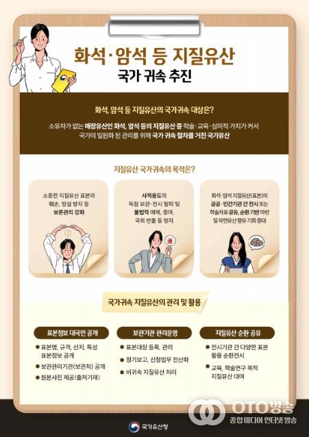 국가유산청은 2020년부터 국공립기관과 대학, 사립기관, 개인 소장자가 보유한 화석이나 암석 같은 지질유산 보유현황을 전수조사하고, 이를 ‘지질유산 표본정보서비스’에 등록하는 지질유산 데이터베이스 구축사업을 수행하고 있다. 관계 전문가의 현장 실사와 가치평가를 통해 각 지질유산에 대한 국가귀속 여부를 판단하며, 최종 국가귀속된 지질유산은 지정된 보관관리기관에서 보존·관리되고, 필요시 추후 건립될 국립자연유산원에서 교육·전시 등을 위한 자원으로 활용될 예정이다. 또한, 국가유산청은 관련 학회, 연구기관과의 긴밀한 협력을 통해 학술적·교육적 활용도 지원할 예정이다.